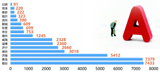 截至2022年9月30日,全省上市公司总市值为35143.00亿元。其中烟台、青岛、济南三市上市公司总市值包揽前三,分别为7432.90亿元、7379.32亿元、5411.75亿元。