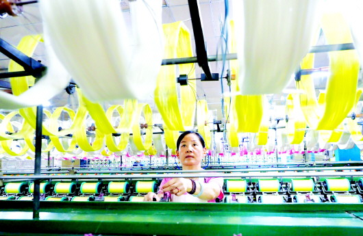 周村是全国纺织产业集群试点地区,图为淄博大染坊丝绸集团有限公司车间一角。 |