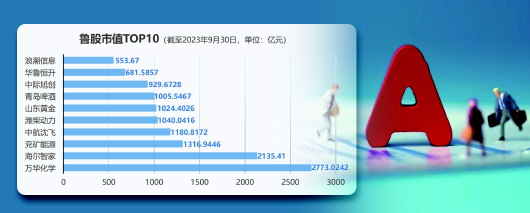 截至9月30日,山东市值排名前十的上市公司总市值为12641.12亿元,总市值超过千亿有7家。其中,万华化学(600309.SH)持续霸榜,市值超2700亿元,高达2773.02亿元;海尔智家(600690.SH)紧随其后,9月末总市值为2135.41亿元,较上月末的2117.68亿元有所上升;兖矿能源(600188.SH)晋级鲁股总市值榜单前三,达1316.94亿元。
