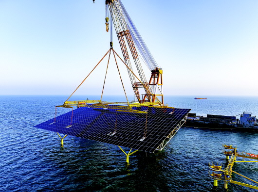 山东海洋能源资源丰富、潜力巨大。图为东营市垦利一海域的光伏平台施工场景。 |